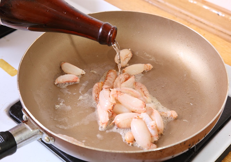 热锅,放入1匙油,加入蟹肉拌炒数下,倒入米酒再拌数下。