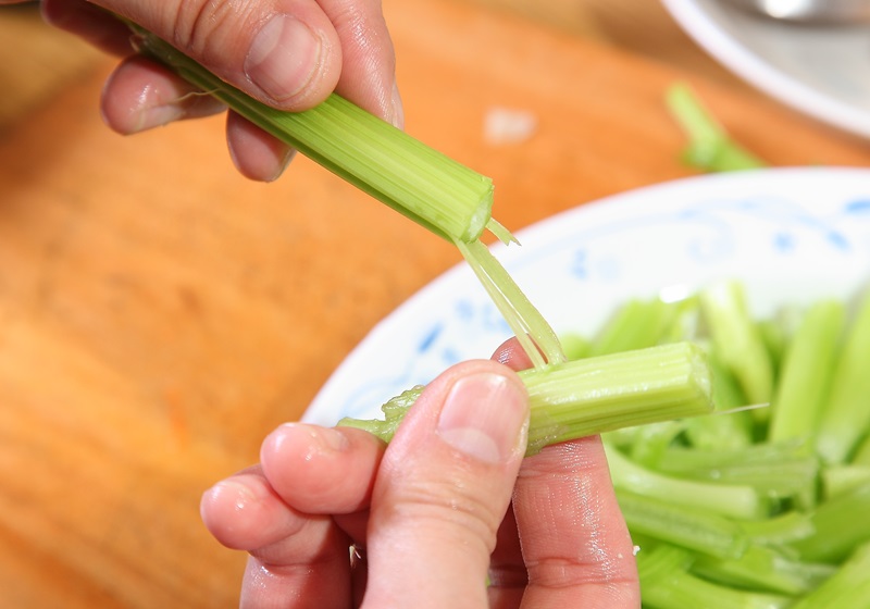 Tips:剔除芹菜管纤维时,可用手将芹菜管折成一段段;每折一段时,都有纤维相连,此时将纤维撕下来即可。不熟练以手除纤维者,也可用刨刀刨除表面纤维,但同时会刨掉部分嫩的芹菜管,较为可惜。