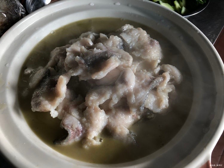 将鱼片倒入酸汤,烫滚成型,继而铺在酸菜上