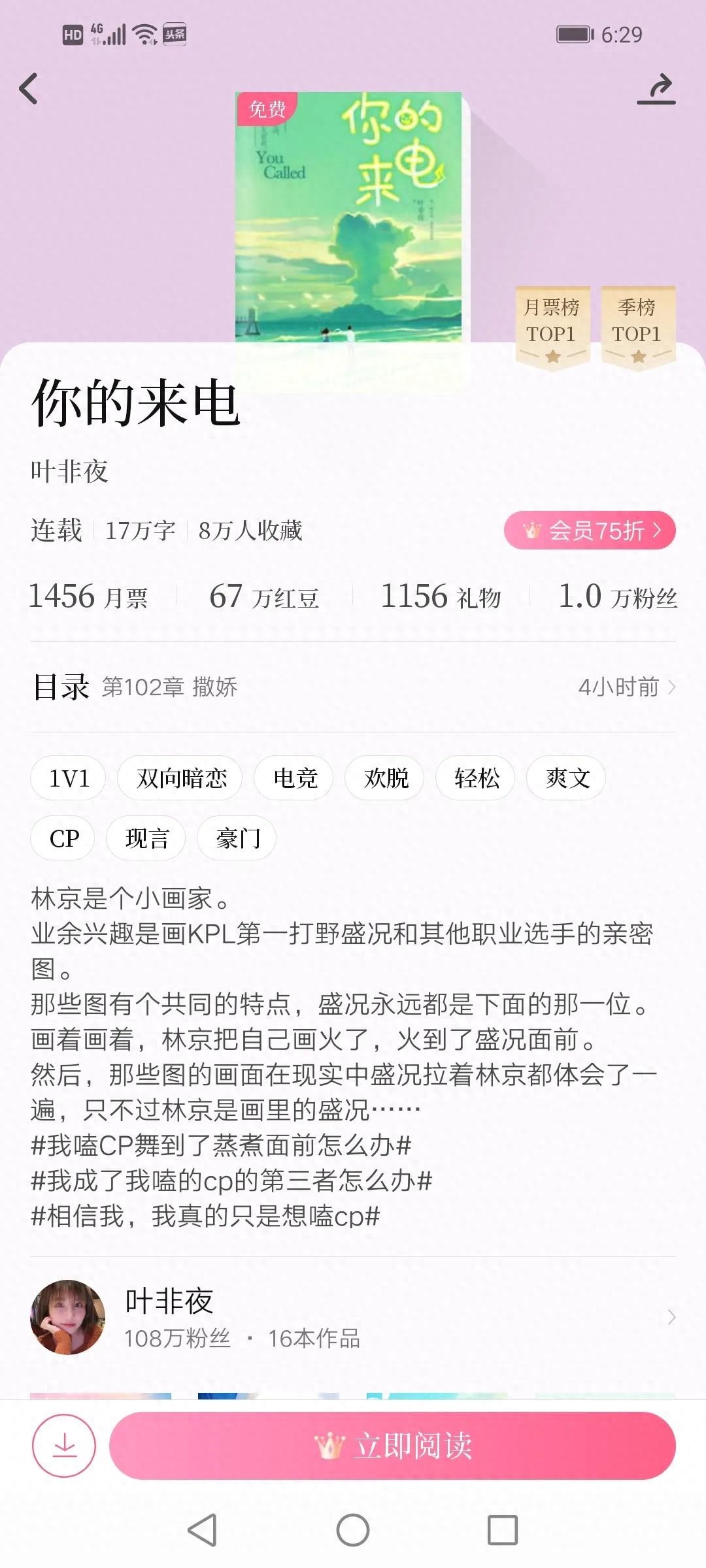 作者叶非夜,阅文集团白金作家,著有《时光和你都很美》《明天也喜欢》等文,红袖添香App上作品粉丝108万,收藏13万,可见其人气。