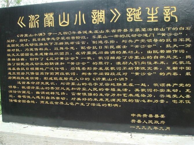 1999年,费县县委、县政府在《沂蒙山小调》诞生地建立了纪念碑、纪念亭,记载了《沂蒙山小调》诞生的过程,以及现今流传的《沂蒙山小调》词曲及作者,以启后人,永志不忘。