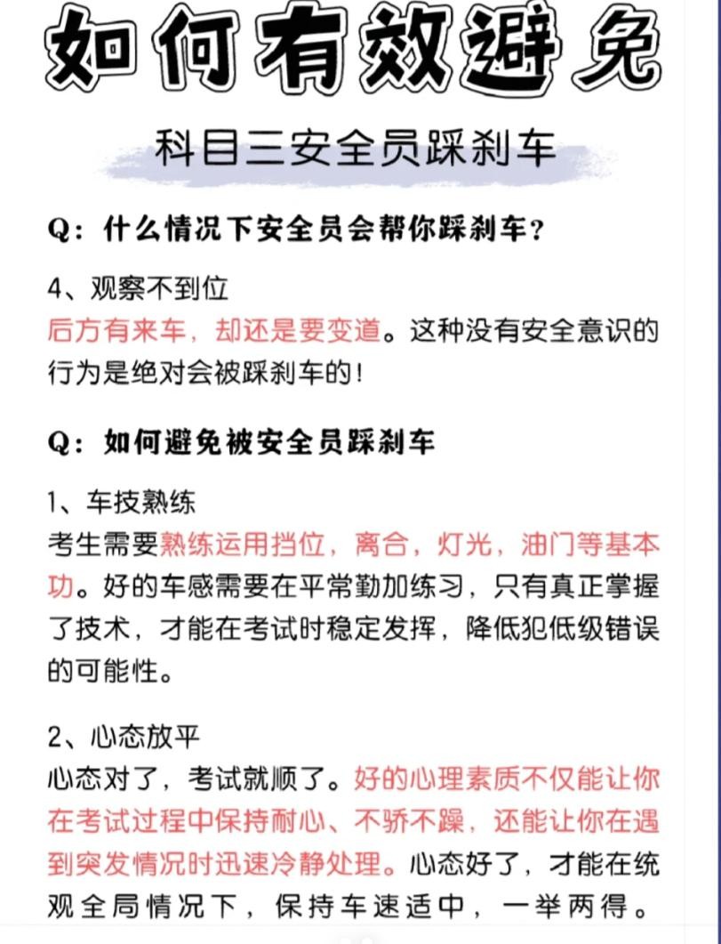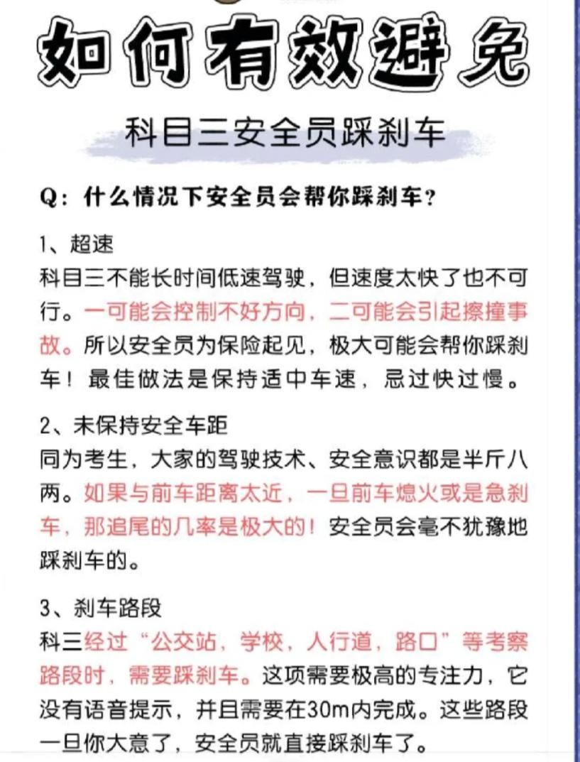 1⃣超速科目三不能长时间低速驾驶,但速度太快了也不可行。一可能会控制不好方向,二可能会引起擦撞事故。所以安全员为保险起见,极大可能会帮你踩刹车!最佳做法是保持适中车速,忌过快过慢。2⃣未保持安全车距同为考生,大家的驾驶技术、安全意识都是半斤八两。如果与前车距离太近,一旦前车熄火或是急刹车,那追尾的几率是极大的!安全员会毫不犹豫地踩刹车的。