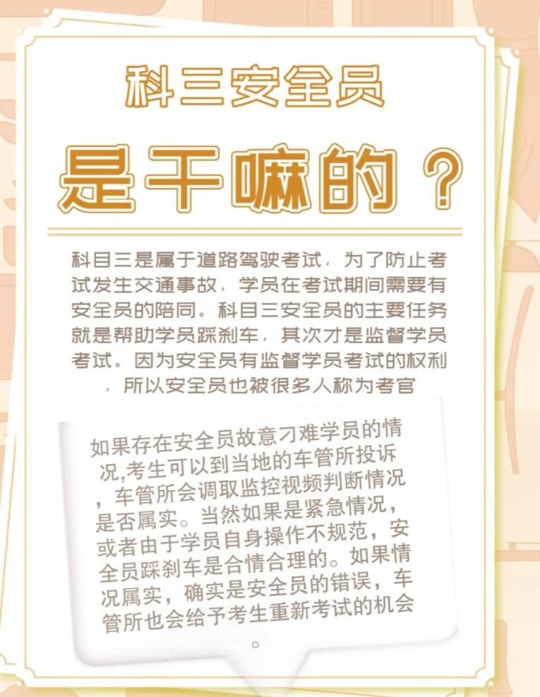 1.科目三是属于道路驾驶考试,为了防止考试发生交通事故,学员在考试期间需要有安全员的陪同。科目三安全员的主要任务就是帮助学员踩刹车,其次才是监督学员考试。因为安全员有监督学员考试的权利所以安全员也被很多人称为考官