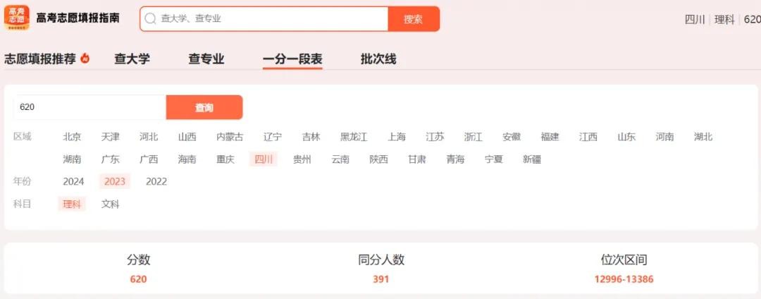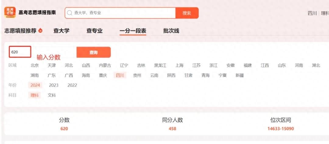 大家可以看到,我选择的省份是四川省,选择理科,输入620分,出现的结果是同一分数段的考生有458人,对应的位次是14633-15090。