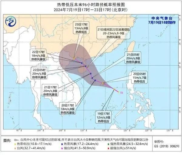 五、南海的热带低压预计将在7月21日夜间至22日凌晨期间,在海南至广东沿海地区登陆。根据预测,该低压在登陆时的强度可能会增强至热带风暴级别。
