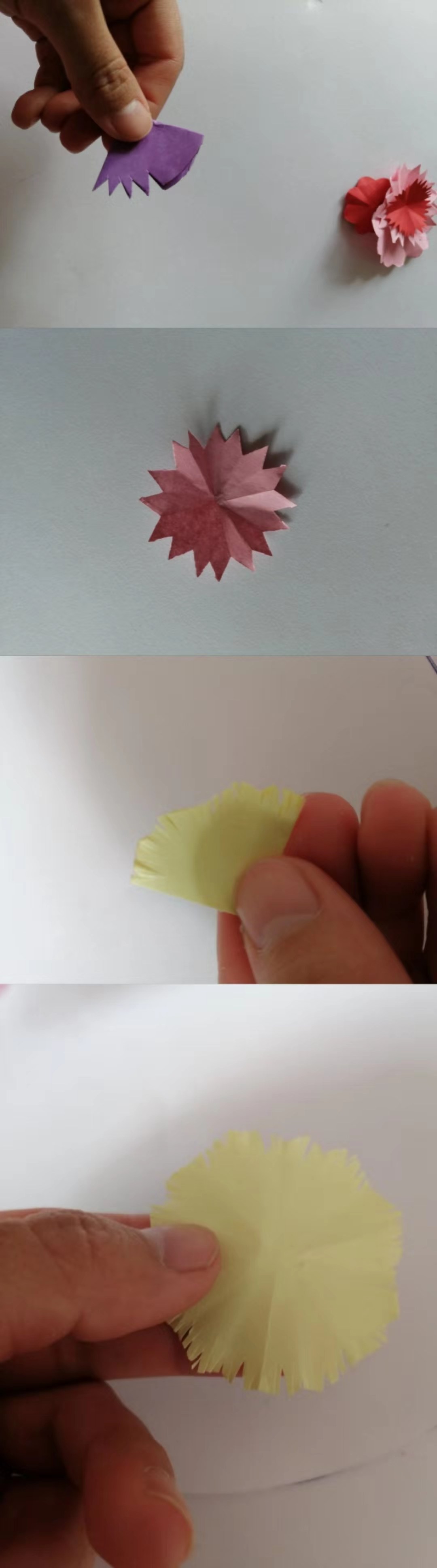 首先剪个彩色小正形,然后沿对角线折叠,再折,总共折四下。如下图,再沿弧线剪下来,打开之后就是一个圆花朵形状。