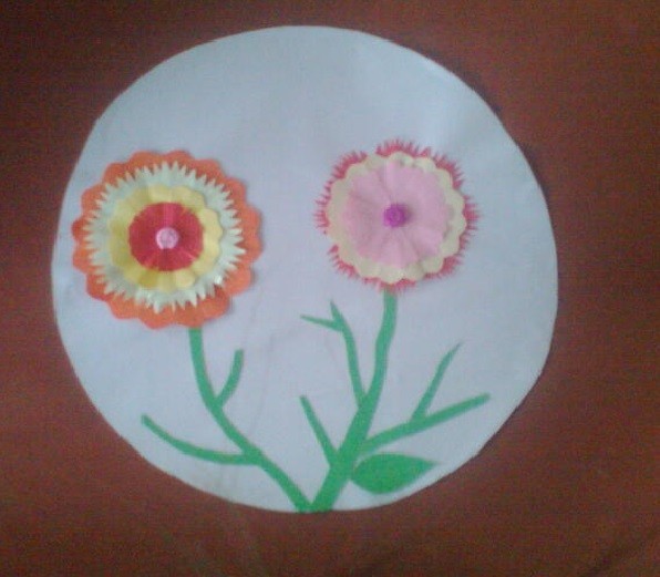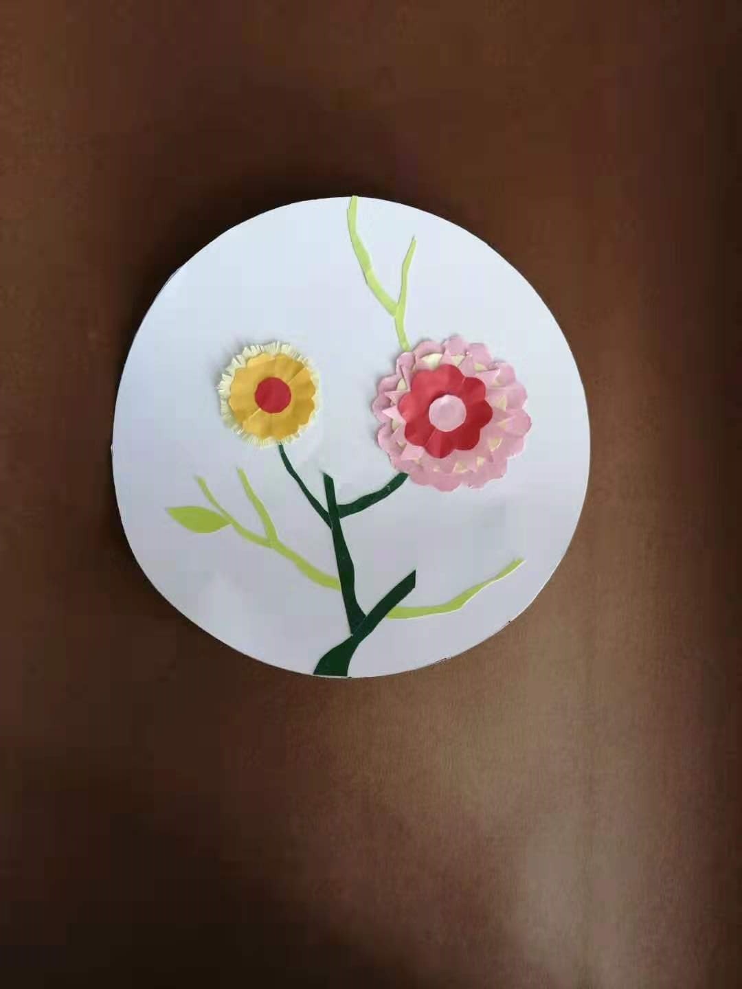 剪好之后开始粘贴。按照大小顺序粘贴,先粘最大的。最后再贴个小圆做花芯。