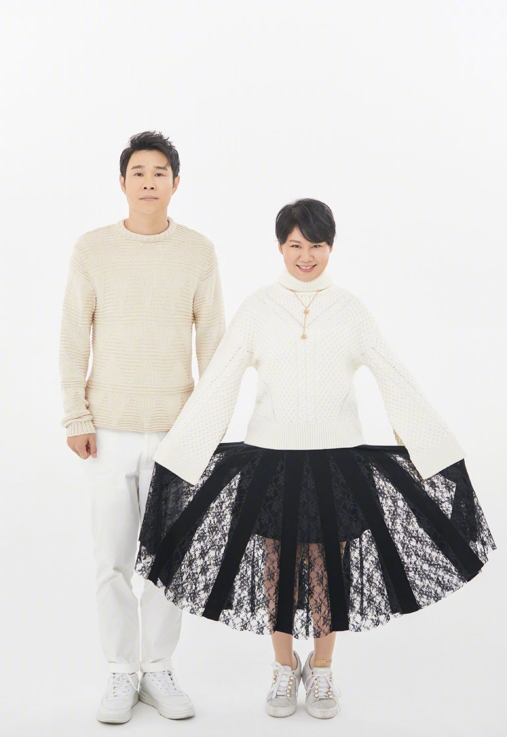 如今两个人看起来都成熟不少,长相却没有太大的变化,宛如冻龄,沈春阳的头发比起16年前更短了一点,穿着白色毛衣和黑色网纱裙,站在一身浅色的小沈阳身边,笑得落落大方,气场十足。
