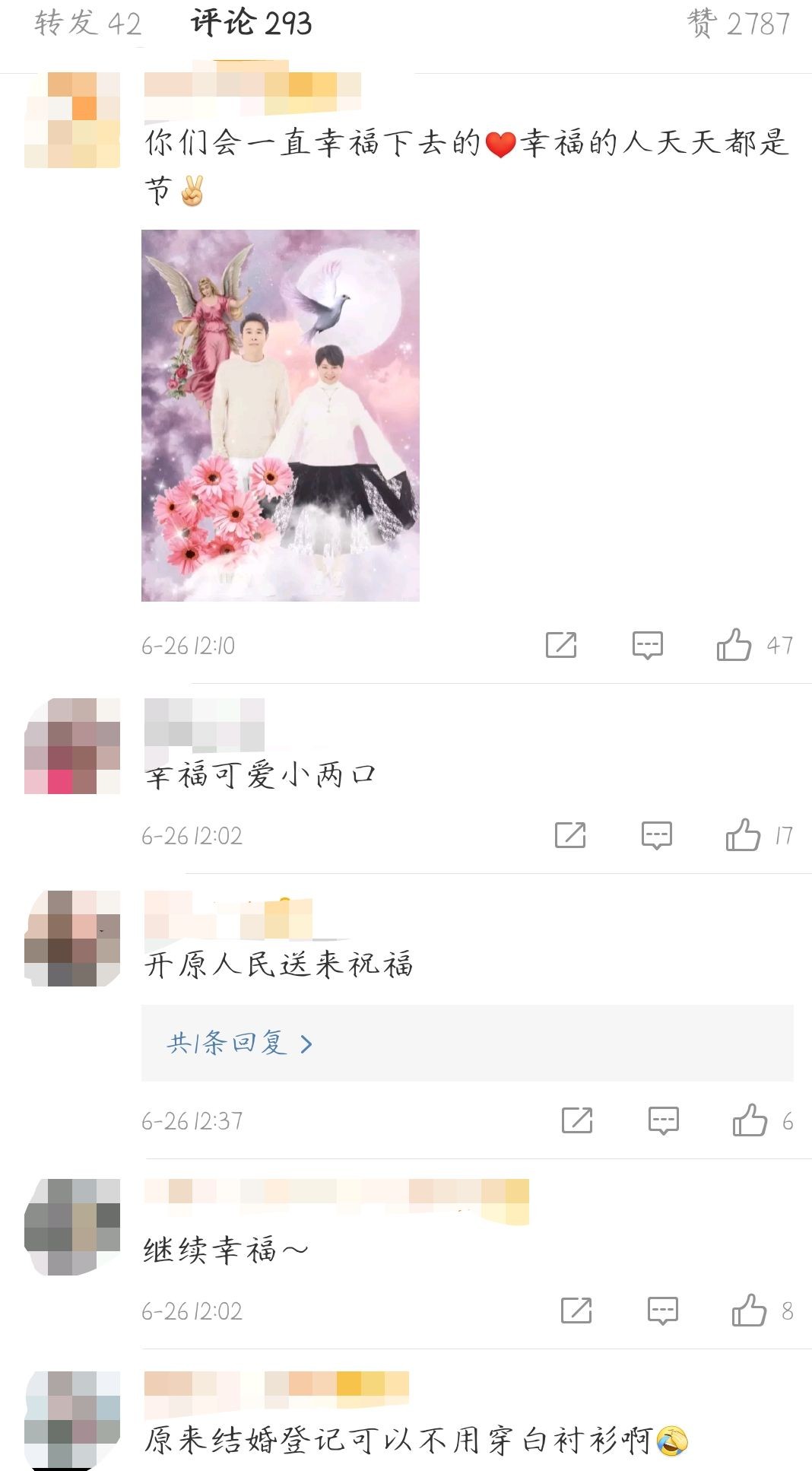 网友也纷纷在评论区为两个人送上了祝福,留言道:"你们会一直幸福下去的,幸福的人天天都是节"、"幸福可爱小两口"等等,还有人注意到两个人登记时的照片,表示:"原来结婚登记可以不用穿白衬衫啊"。