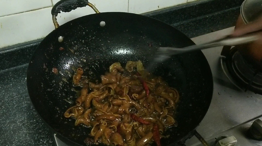 下面起锅烧油,油温烧好下调料炒香,火锅料炒散,再下去牛肠继续煸炒,大概2分钟的样子,牛肠有点煸干,加清水大火烧开,小火煮20分钟。