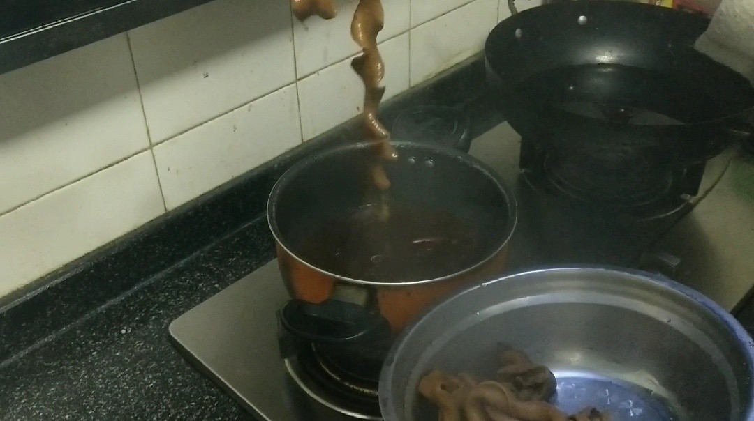 另外准备一口锅,把洗干净的牛肠加进去,然后加香叶,八角,桂皮,花椒,干辣椒,草果,食盐,生抽,老抽,醋
