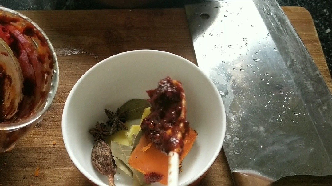 小碗里面准备调料:豆瓣,干花椒,干辣椒,火锅料,姜,蒜,香叶,草果,八角