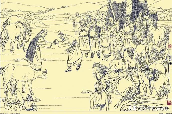 这一天,尧来到了历山,就是舜居住的地方。在那里,他看见一个年轻人正驾着一头黄牛和一头黑牛在犁地。这个人手中没有拿鞭子,而且每只牛的屁股上都绑着一个簸箕,这让尧感到很奇怪。当时,有一个头发花白的老人担着一担柴从远处走来了。小伙子看到以后,急忙放下手中的农活,跑过去接了老人的担子,一直帮老人挑到山下。等老人走到尧面前时,他拱手问道:“老人家,这个小伙子是你儿子吗?”老人说:“不是,他是我们的小首领舜,我是他的百姓。”尧又问:“那既是首领,还帮你担柴?”老人笑着说:“这你就不了解他了,我们的小首领和别的首领可不一样,他见谁有困难就帮助谁,还不用别人替他干活,你没见他正在犁地吗?"