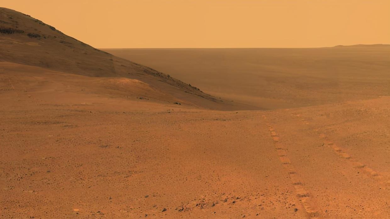 美国宇航局的机遇号火星探测器拍摄了这张红色星球上开阔地形的照片。