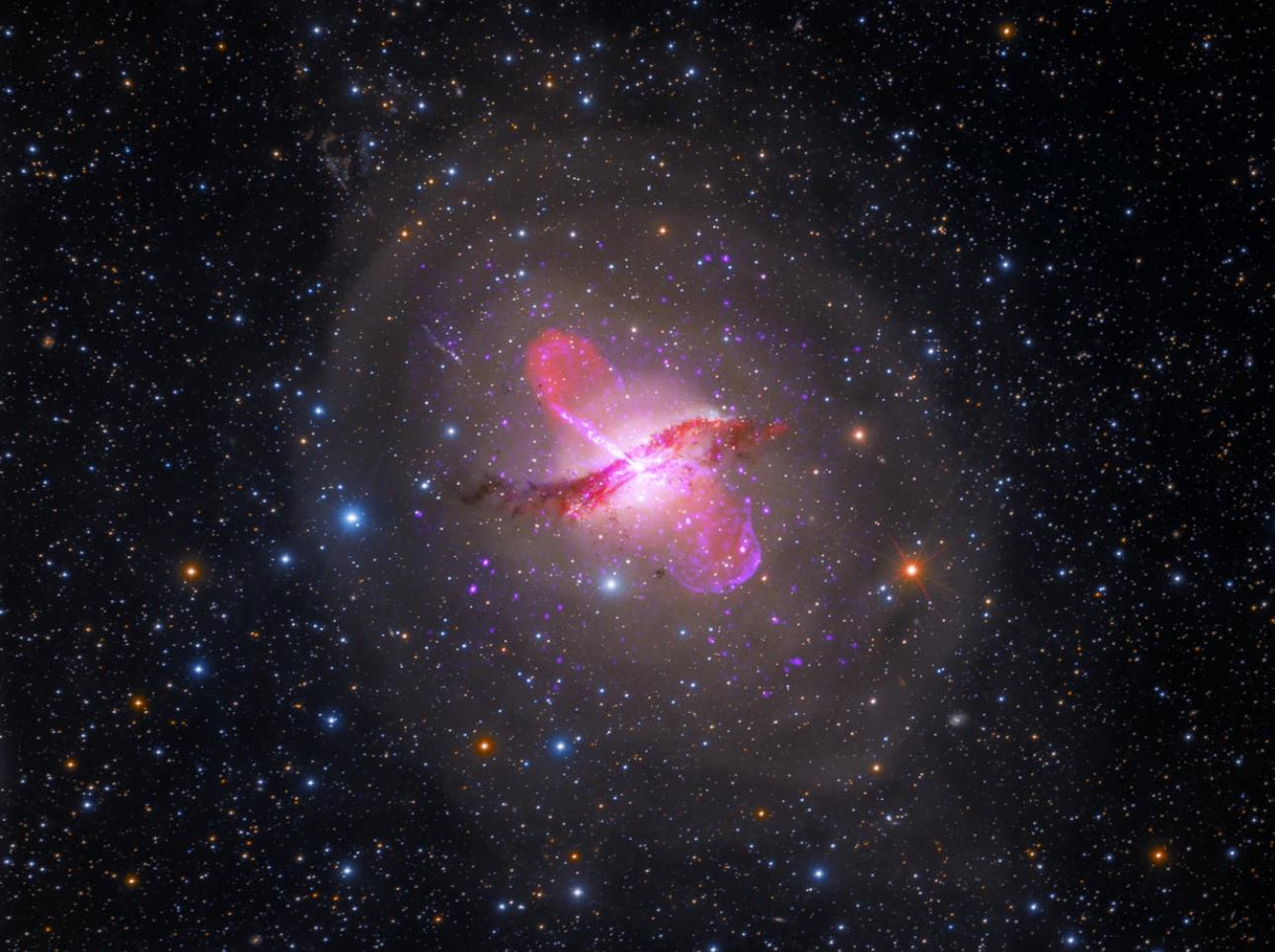 这张图片是哈勃太空望远镜的可见光信息和新墨西哥州甚大阵列射电天文台的无线电数据的合成。