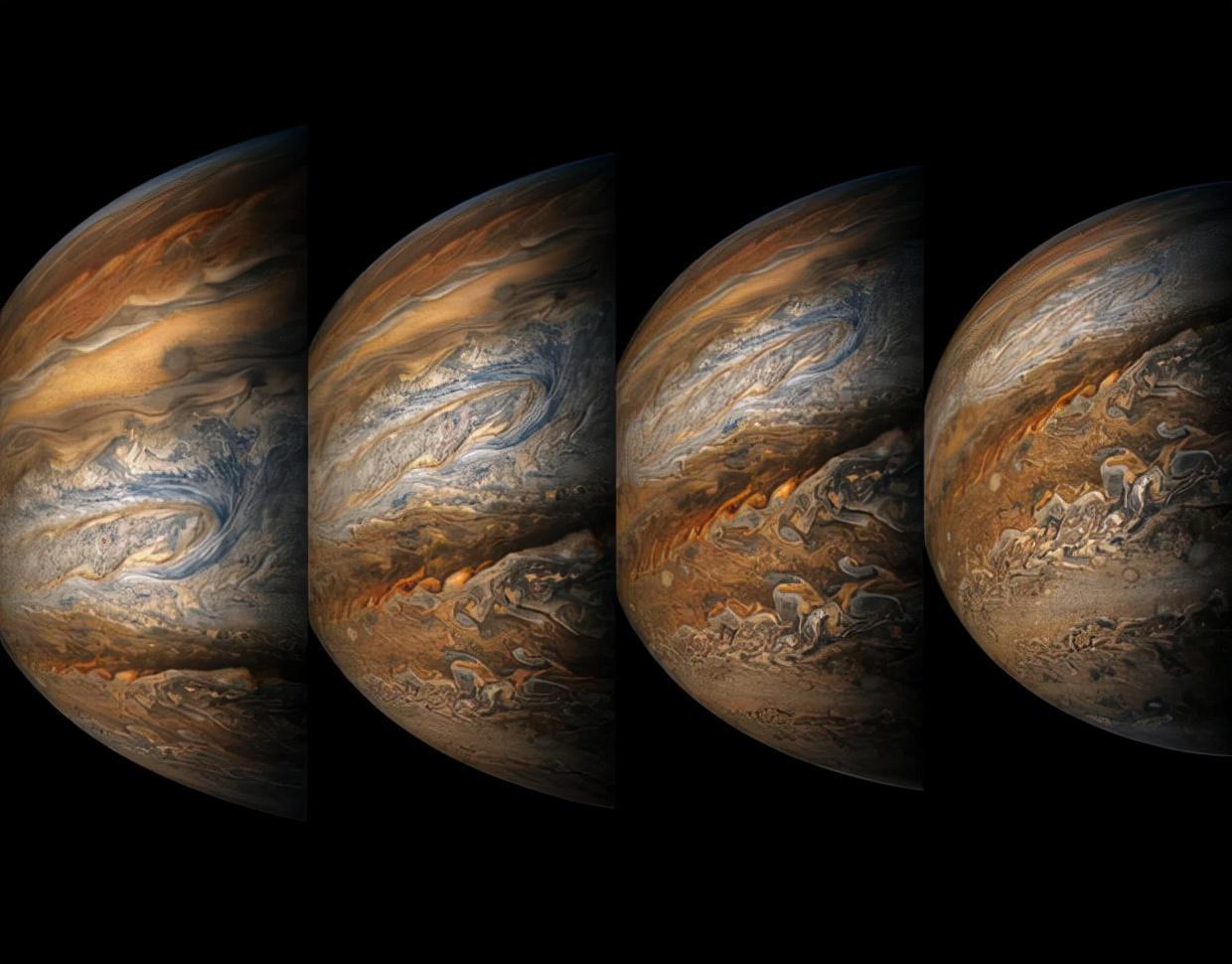 美国宇航局的朱诺号宇宙飞船于 2016 年抵达气态巨行星木星,至今仍处于活跃状态。无人驾驶探测器捕捉到了这张木星湍流大气的图像。