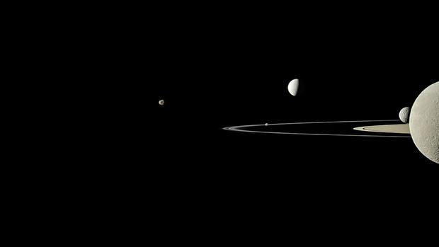 从左到右,这些卫星是 Janus、Pandora、Enceladus、Mimas 和 Rhea。