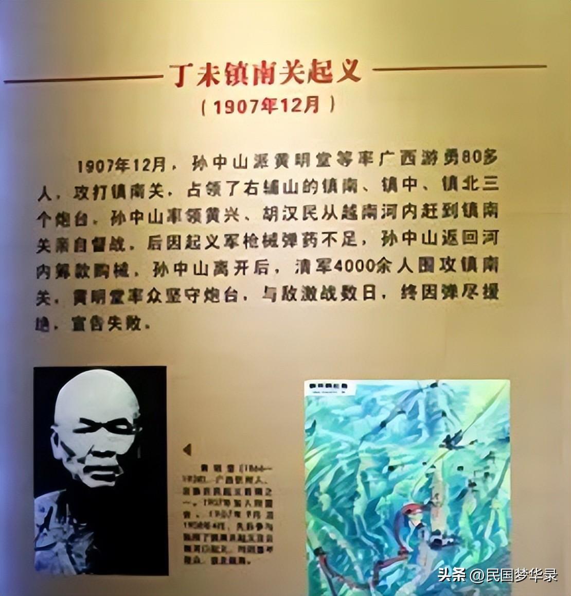 孙中山和黄兴领导。同盟会会员黄明堂等率众潜袭广西镇南关,很快占领鸡金山的三座炮台,农民群众和散兵游勇纷纷来投。孙中山、黄兴在镇北炮台指挥。孙中山亲自开炮轰击敌人,为伤员包扎伤口,使起义军深受鼓舞。孙中山亲自点炮时激奋地说:“吾反对清政府二十余年,此日始得亲自发炮击清军耳!”清军以五千人兵力反扑,义军坚守数日,枪弹告罄,遂弃台后退。起义失败后,清政府将革命军及帮助革命军送枪送水的群众全部屠杀,流血数十里。