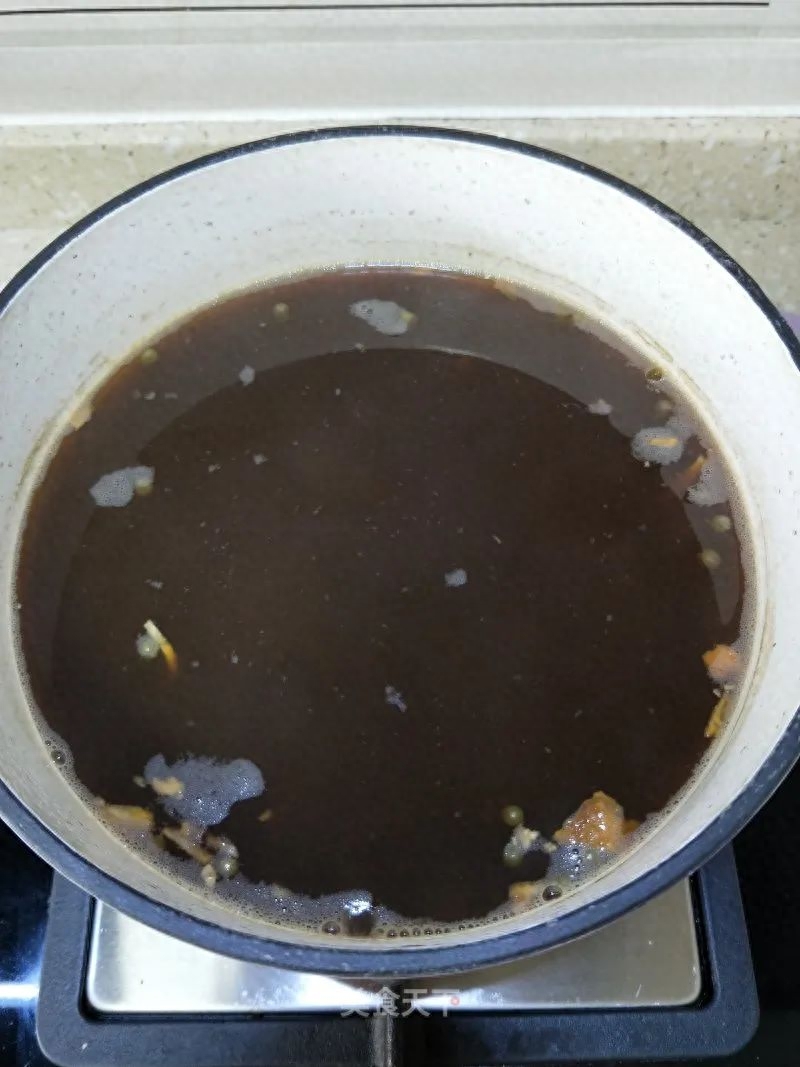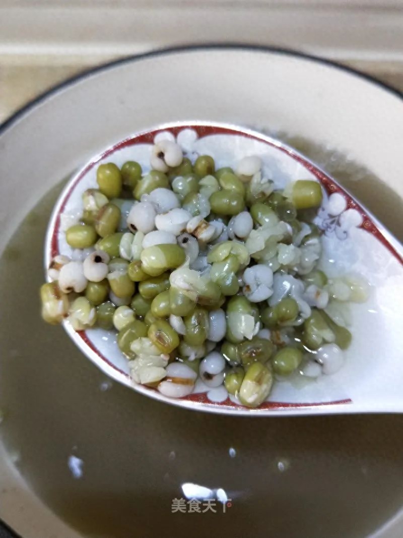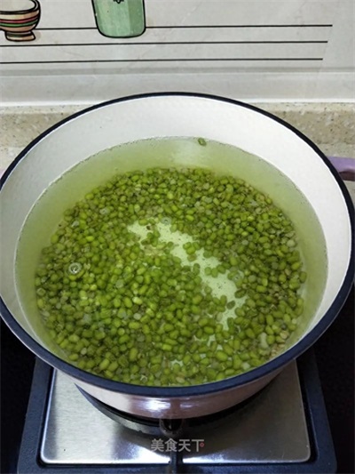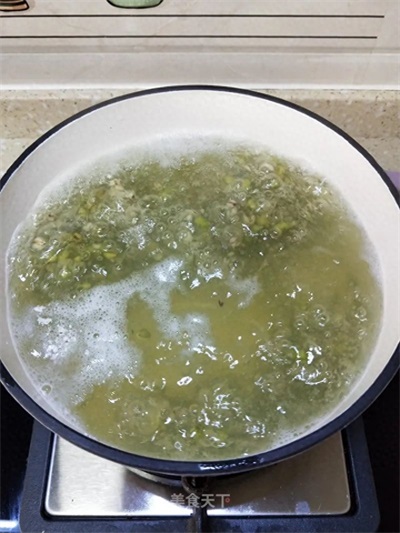 3. 煮开一锅水,倒入绿豆、薏仁米。