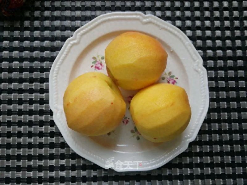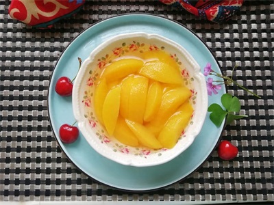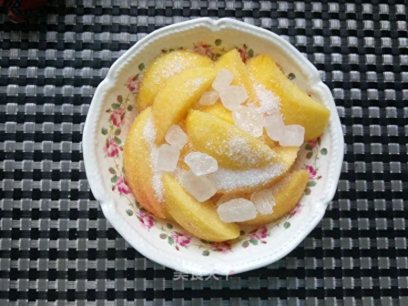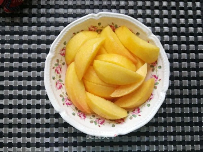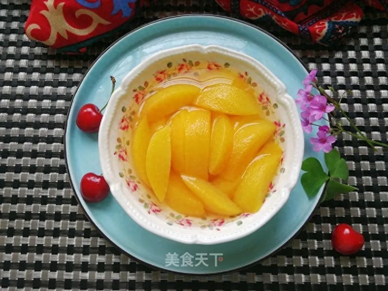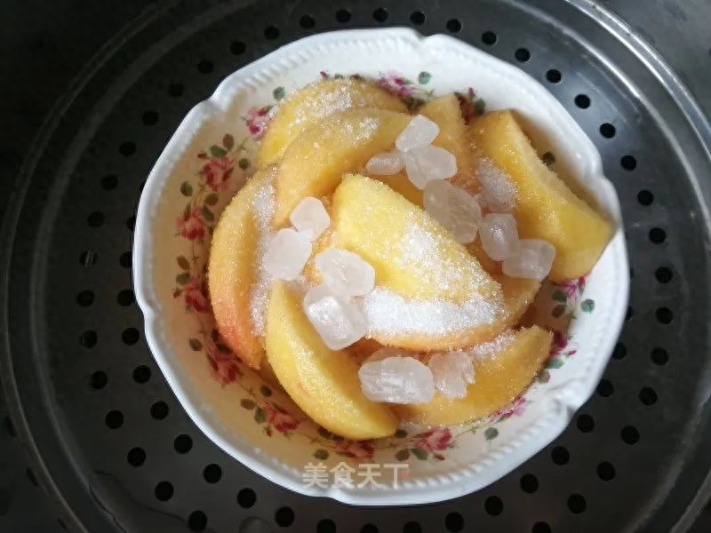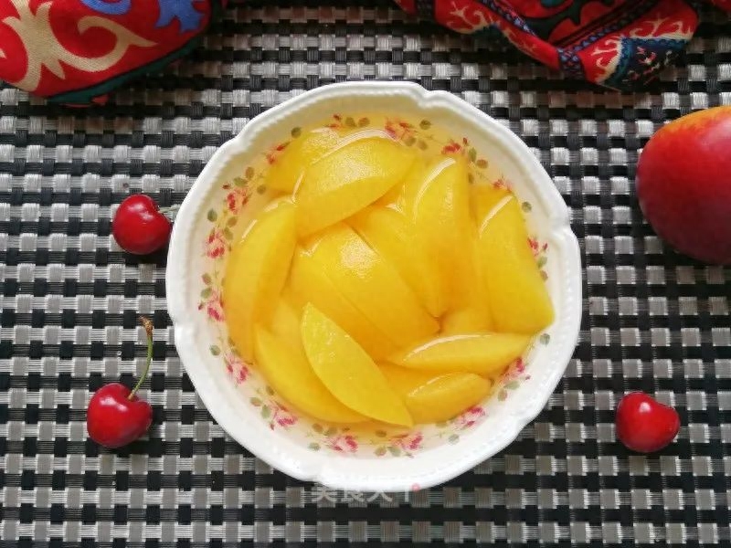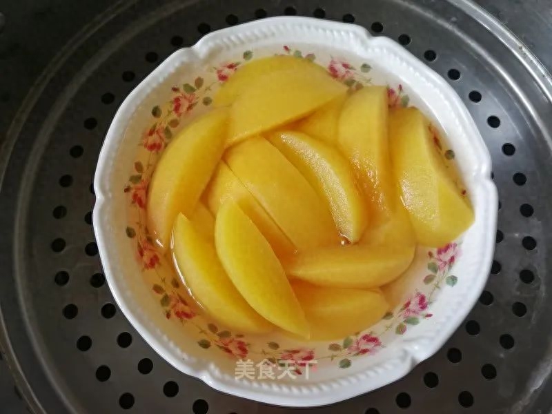 6. 蒸好的油桃糖水,冰糖已经融化,汁水丰盈,颜色更漂亮了,散发出诱人的光泽。自然冷却,盖上盖子放冰箱冷藏一下,冰甜爽口,口感更棒。
