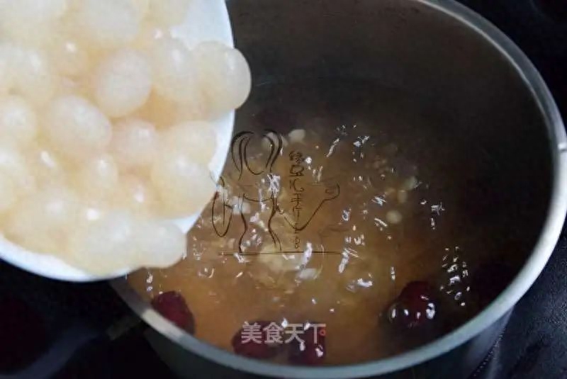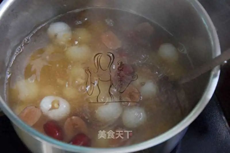 6. 加入龙眼稍煮一会儿,新鲜龙眼肉不宜煮太久。