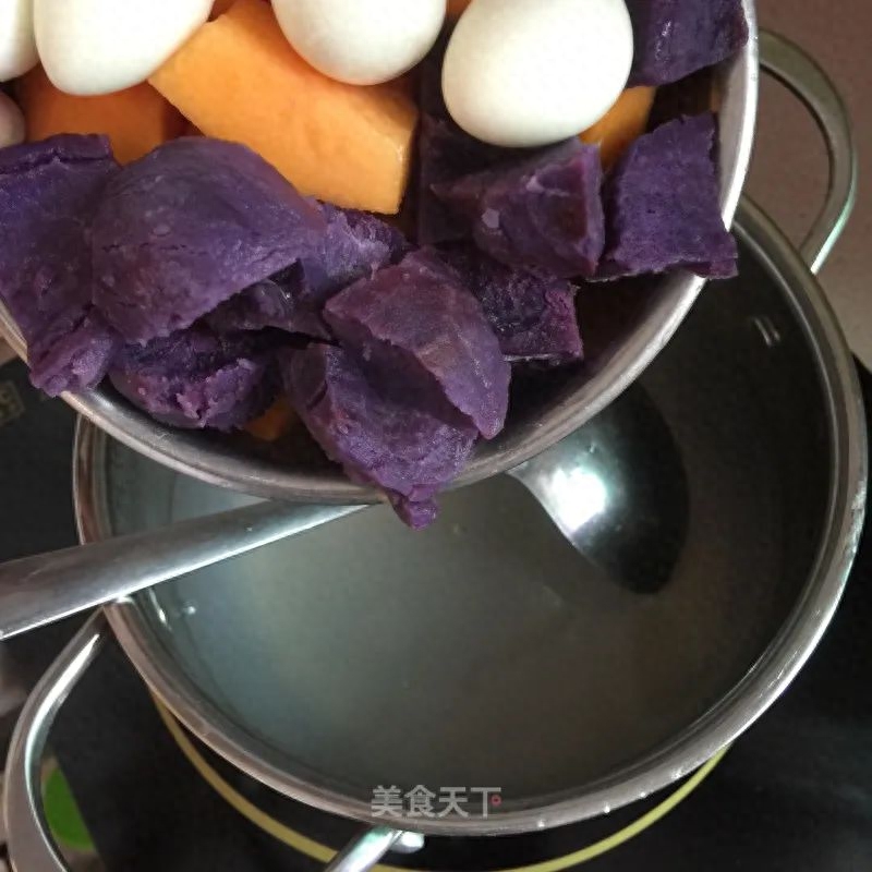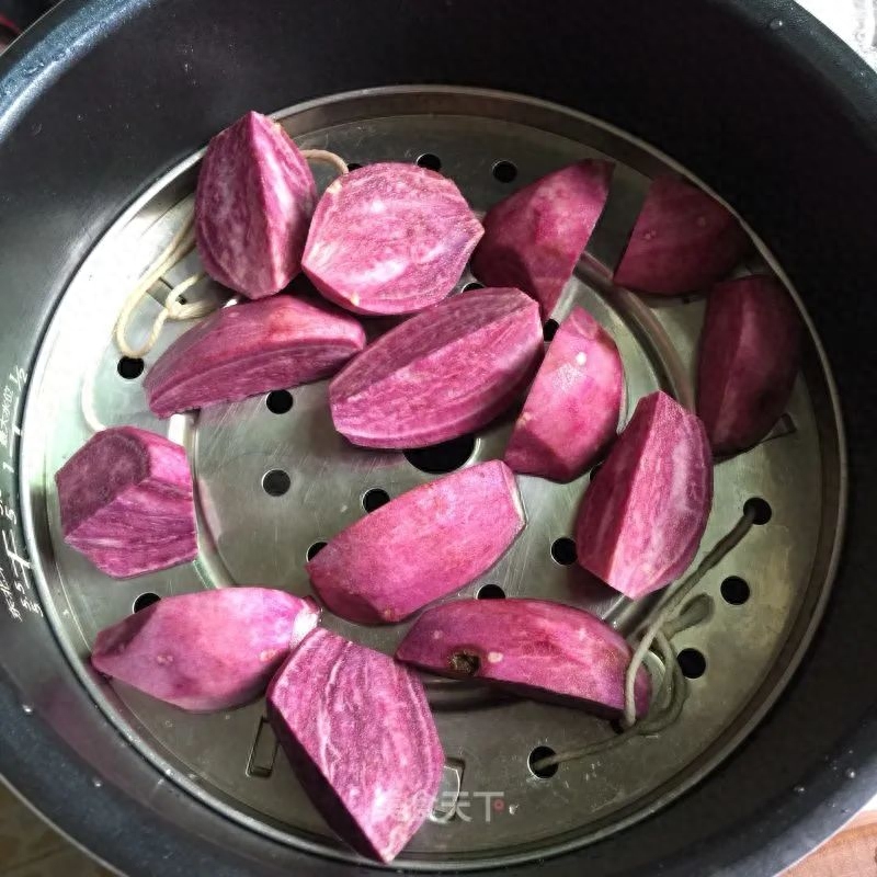 2. 将紫薯去皮洗净切块,放蒸笼里隔水蒸熟。(蒸紫薯的同时可将鹌鹑蛋放水里一起煮熟)