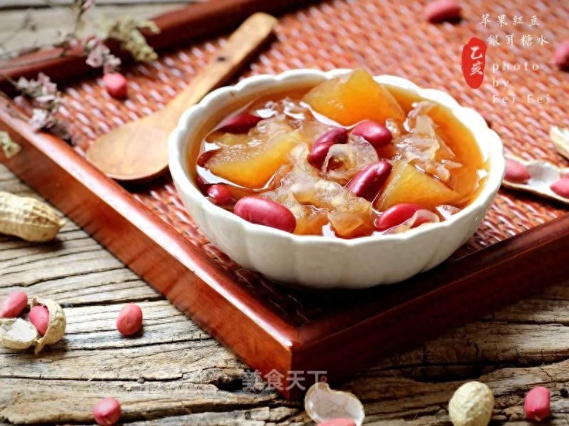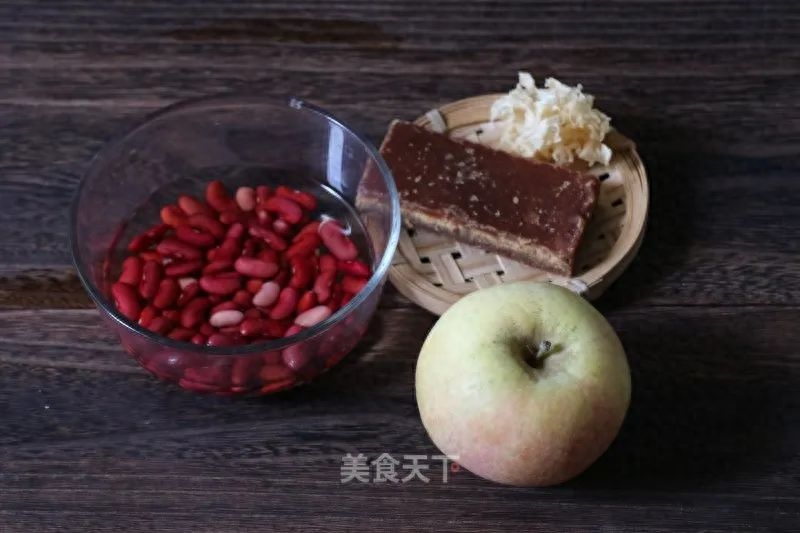 1. 准备、红豆和银耳提前一晚泡发.把苹果洗净切丁。