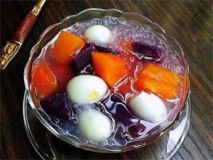 9. 成品盛碗,打入西米拌均即可食用。(也可放冰箱冷藏后食用)。