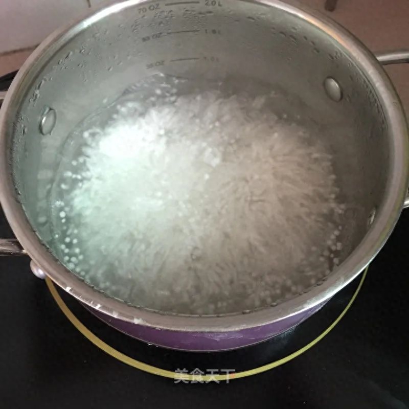 5. 取一小锅加入适量水烧开,加入西米煮10分钟左右关火,盖住虚焖10分钟。(可重复步骤一次直至西米透明为止)。
