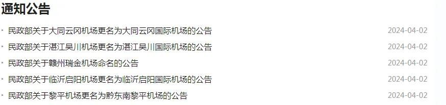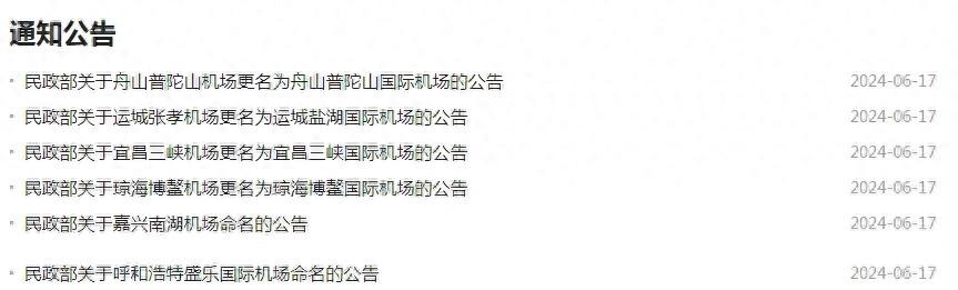 6月17日民政部官网公布了6个机场的标准名称,其中多达5个国际机场或者命名或者更名。