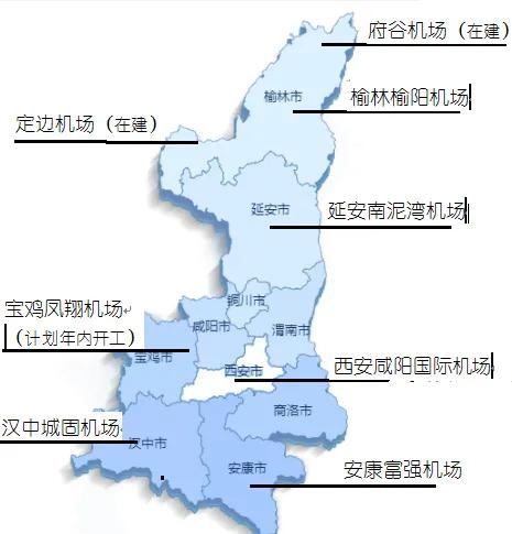 陕西现有5座民用运输机场,此外,还有府谷、定边两座县级机场在建,宝鸡凤翔机场计划年内开工。