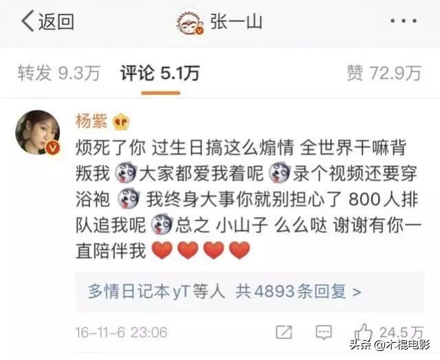 11月6日,是杨紫27岁的生日。张一山在微博上发了一条祝福,随后杨紫也在评论区留言。