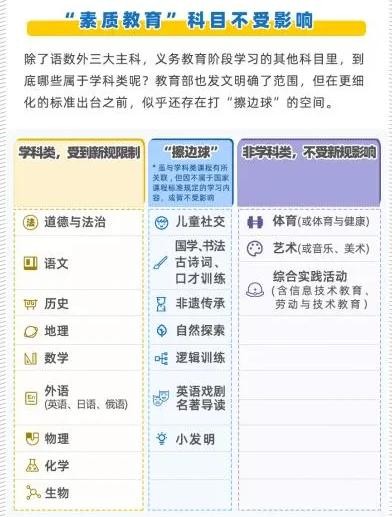 下面这张图其实已经给了我们最新的回应,哪些校外培训班还可以继续开呢?首先是“素质教育”的所有科目,都将不受影响,比如体育、艺术类。