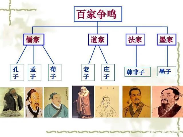 先秦的诸子与百家,今人有明确区分,即“诸子指各派的代表人物”,百家指“各学派”。《汉书·艺文志》列出儒家、道家、阴阳家、法家、名家、墨家、纵横家、杂家、农家、小说家10家。其实并不止这些。然而论起主要学派来,应当是儒、道、法三家,它们不仅有明确的传授系统、丰富的著述和理论体系,而且对中国后代思想影响甚大;其次为墨家、名家,它们虽然对后世影响较小,但在当时的地位相当重要,并且有着自己的理论和著述;至于阴阳家,虽然在哲理体系上谈不上完整和严密,但对于后世的影响却不容忽视。