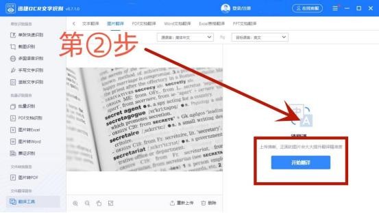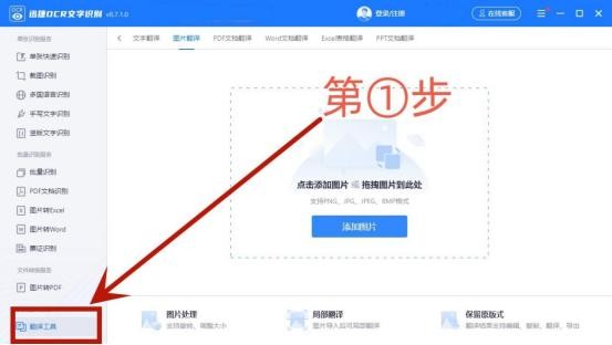 第一步:首先打开这款程序,在左下栏选择【翻译工具】,再选择【图片翻译】选项,然后将需要翻译的图片上传就可以啦;