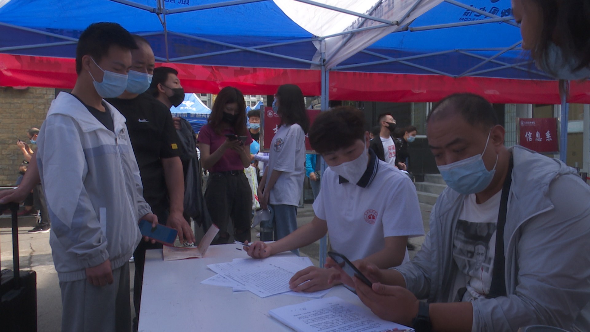 上午前来报到的学生正整齐有序的进入校门,门口设有专人负责消杀工作,为大家的健康和安全保驾护航。同时,学校增设的报到、缴费、宿舍安排工作窗口,全部集中在露天区域,方便新生快捷办理手续。