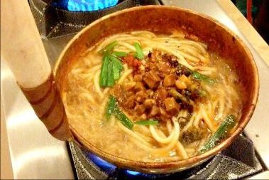 第二种就要属昆明小锅米线了。小锅米线,顾名思义也就是小锅煮就。小锅又分砂锅和铜锅。砂锅多孔,煮出来味厚;铜锅光滑,煮出来利口,各具风味。作者喜欢小锅米线的理由和甜咸口味的烤饵块类似-混合口味感。韭菜的甜、酸菜的酸、肉沫的香以及臭豆腐的臭香,一顿乱煮,最后成就了独具一格的风味。