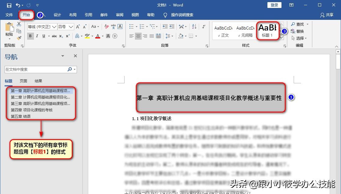 1、打开Word文档,将文档的所有章节标题应用【标题1】的样式。