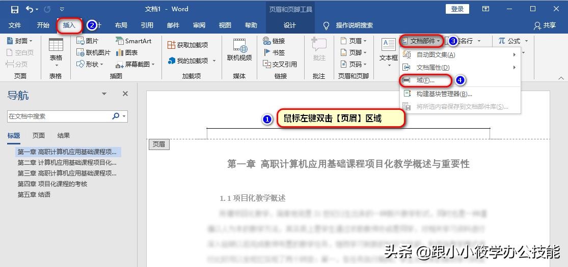 2、鼠标左键双击【页眉】区域,进入页眉页脚可编辑的状态,点击菜单栏的【插入】选项卡,在【文本】工具组中点击【文档部件】,选择【域】。