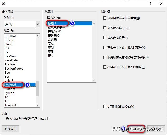 3、弹出【域】属性设置对话框,在【域名】栏选择【StyleRef】,【样式名】默认选择【标题1】,点击【确定】按钮。