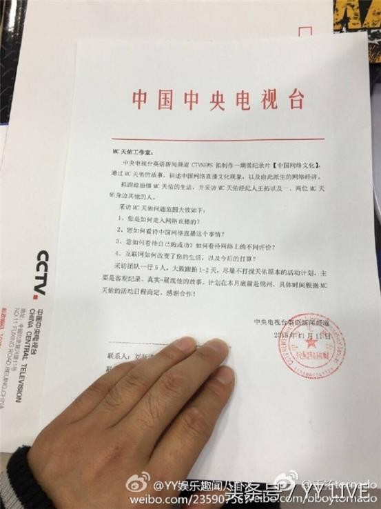 据悉,天佑参与拍摄的纪录片——《MC天佑专题纪录片》,将强势登陆中央电视台CCTV英语频道 (CGTN),首播时间定在明天中午12:00-13:00 Global Watch,欢迎届时收看并录制视频。