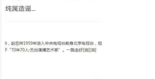 正当很多人都为赵忠祥被曝因病去世,这个并没有得到确切的回复消息难过的时候,微博账号“赵忠祥助理”出面辟谣,表示该消息并不属实,纯属造谣。