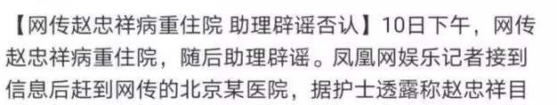 在微博名为“赵忠祥助理”的账号上,也连续发布两条内容,一条说纯属造谣,还有一条写“赵忠祥老师最近在家”。有媒体在报道中,也提及了这个账号上发布的内容,不过他确认赵忠祥确实住院了。