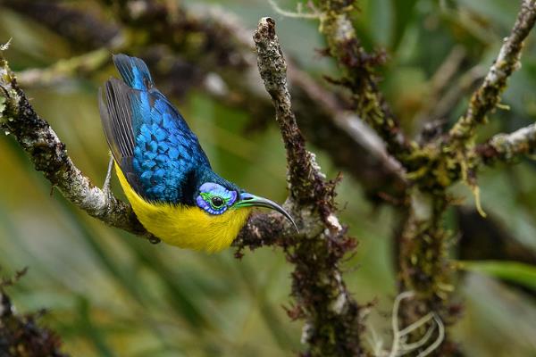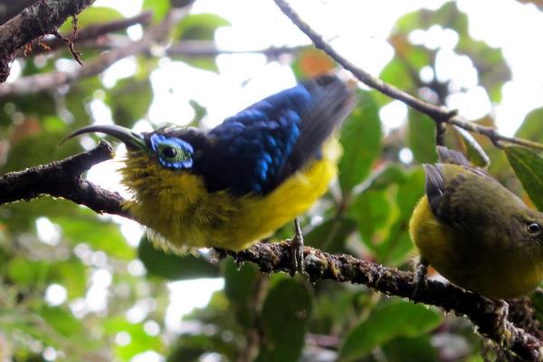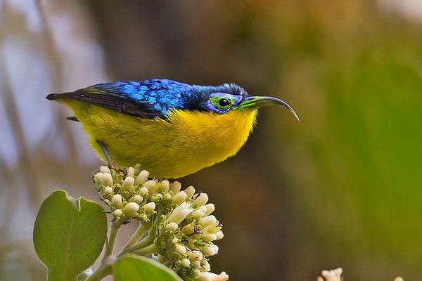 小弯嘴裸眉鸫和弯嘴裸眉鸫都是裸眉鸫科中的一员,它们的形状简直不妨用“鸟中双胞胎”来刻画,二者都具有着明黄色的腹部和宝蓝色的眼垂肉,而且背部和党羽的羽毛也都浮现鲜亮的荧光蓝,而且它们的喙部都是又细又尖,而且前端下弯的,瞅起来便像是一根吸管,十分符合采蜜。