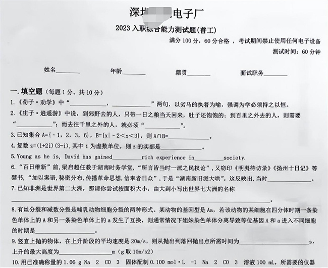 近日在网上看到一张深圳某电子厂2025年入职时的一套综合能力测试题(普工),世界的内容上面有众多数理化的知识,甚至还包含了文言文的《庄子》《荀子》,还有部分的英语试题等等,这一现象引发了网上的热议,众多网友看完之后也觉得试卷太难,想进厂的难度也越来越大了,能进电子厂的不会答这些问题,能答出来的也不用进电子厂了。