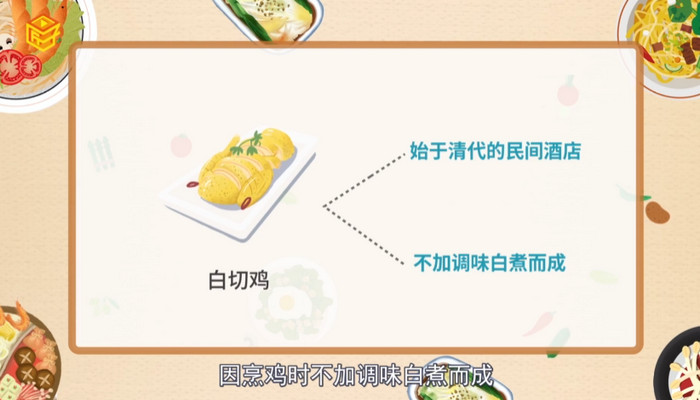 白切鸡始于清代的民间酒店,因烹鸡时不加调味白煮而成。成菜后,色洁白带油黄,皮爽肉滑骨香,清淡鲜美。
