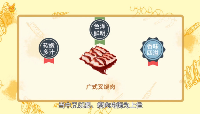 叉烧肉质软嫩多汁、色泽鲜明、香味四溢。当中又以肥、瘦肉均衡为上佳,称之为“半肥瘦”。