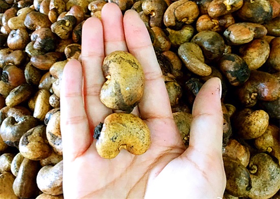 就是因为这些原因,导致腰果不能像瓜子那样直接带壳售卖。必须先经过人工剥壳处理以后,才能进入市场,这也是市场上的腰果都不带壳的原因。不过因为完全不带壳会导致不卫生,所以现在很多腰果都带了薄薄一层内壳包衣,手一搓就掉了(下图)。