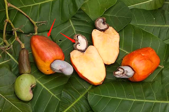 上图颜色鲜艳的部分就是腰果的果肉,其实准确的说不是果肉,它应该叫“假果”,本质上是由花托部分发育而形成的果肉。腰果的果肉可以直接生吃,口感类似于苹果,鲜甜可口。但是不耐存放和运输,所以市场上很少见。