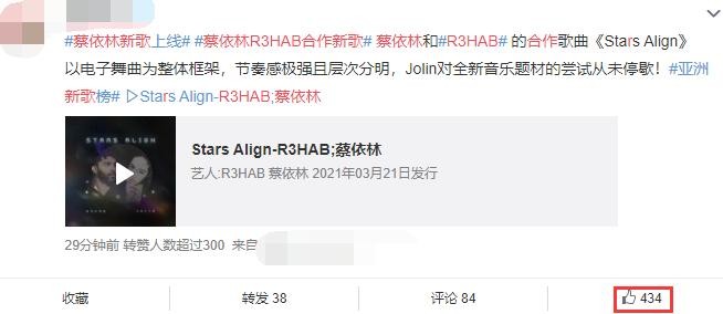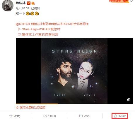 2021年3月21日一大早,歌手蔡依林就在自己的个人社交平台发出了一首新歌《Stars Align》,这首歌是她和全球百大DJ,著名音乐人R3HAB合作制作的一首的电子音乐,歌曲节奏明快曲风活泼,循环洗脑潜力不输《小苹果》。